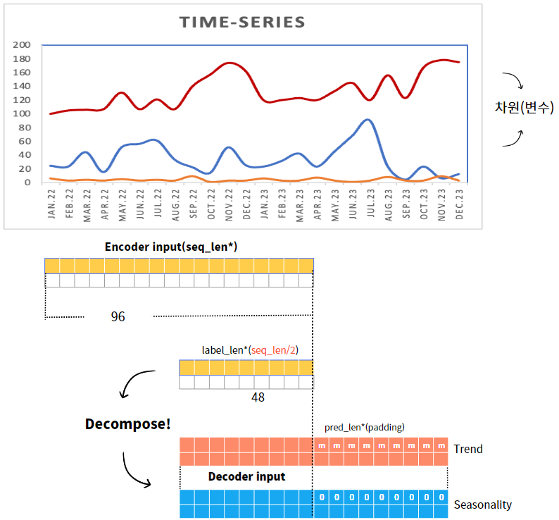ํํธ ๋์ฝ๋์ ์ธํ์ ์์์ ์๋ฅธ label_len๋ฅผ ์์๋ถํด(Series Decompose)ํ์ฌ ํ์ฑ๋๋๋ฐ, ์ฌ๊ธฐ์ ์ฃผ๋ชฉํด์ผ ํ ๊ฒ์ ๋ฐ๋ก Series Decompose์ padding์ด๋ค.