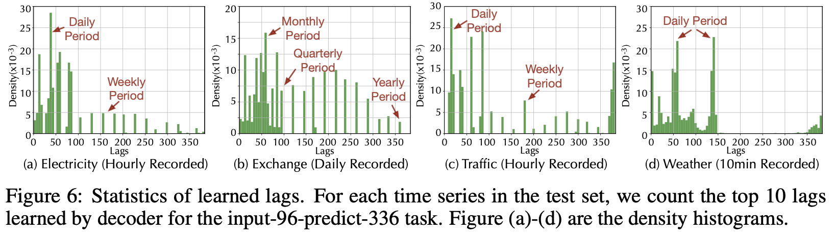 Model Analysis์ ๋ง์ง๋ง์ผ๋ก, ์ฐ๊ตฌ์๋ค์ ํ์ตํ lags์ ๋ฐ๋ฅธ ๋ฐ๋๋ฅผ histogram์ผ๋ก ์๊ฐํํ์๋ค.