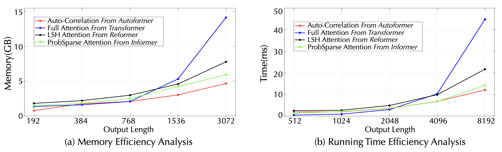 ์ด Autoformer๋ ๋ฉ๋ชจ๋ฆฌ ํจ์จ์ฑ, ์๊ฐ ํจ์จ์ฑ ์ธก๋ฉด์์ ํ ๋ชจ๋ธ๋ค์ ๋นํด ๋ ์ข์ ๊ฒฐ๊ณผ๋ฅผ ๋๋ค.