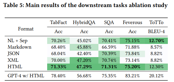 ๋ํ, ๋ฐ์ดํฐ ์ ์ฅ ํ์์ ๋ค์์ฑ๋ ์ค์ํ ์์์ด๋ค. CSV, JSON, XML, Markdown, HTML , XLSX ๋ฑ ๋ค์ํ ํ ์ด๋ธ ์ ์ฅ ํ์์ ๊ฐ๊ธฐ ๋ค๋ฅธ ์์ค์ ์ ๋ณด ์์ถ์ ๊ฐ์ง๋ฉฐ, LLM์ด ํ ์ด๋ธ ๋ด์ฉ์ ์ดํดํ๋ ๋ฐ ์์ด ์๋ก ๋ค๋ฅธ ๋์ด๋์ ๊ณผ์ ๋ฅผ ์ ์ํ๋ค.
